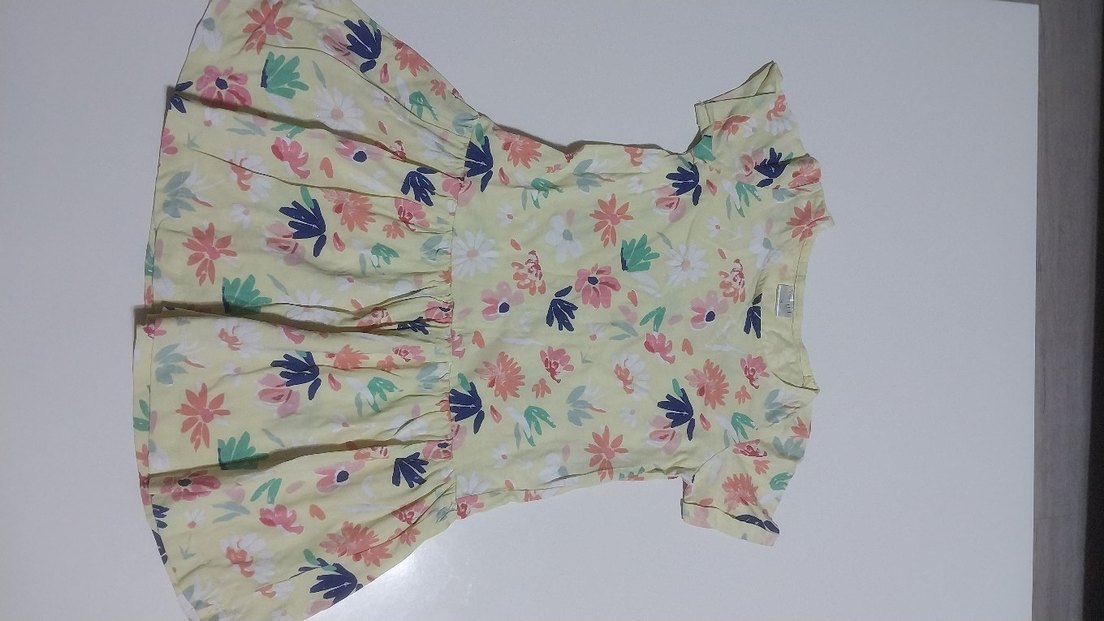 Çiçek desenli, bol kesim kız çocuk elbisesi. Kısa kollu, tekne yaka ve fırfırlı detaylara sahip, sentetik kumaştan yapılmıştır.