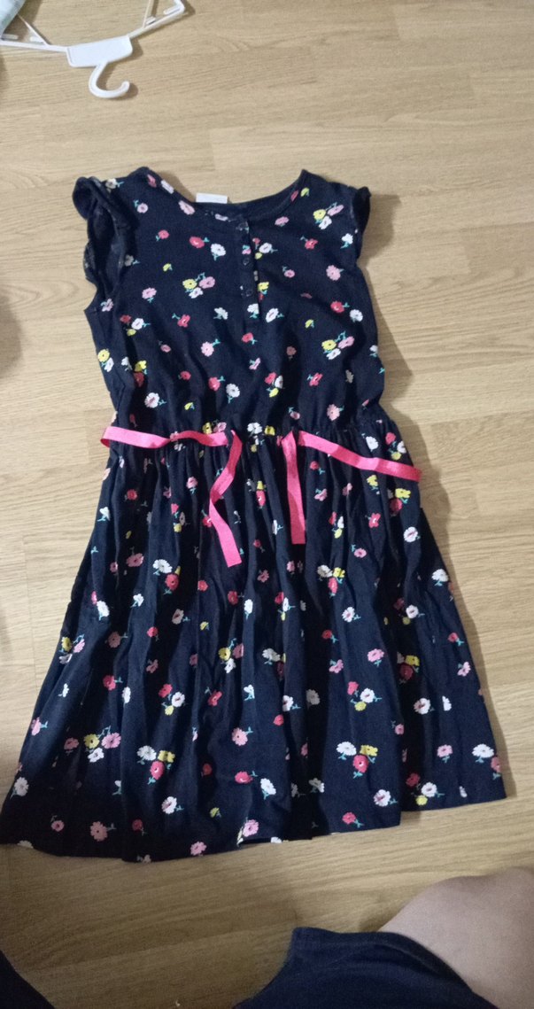 Renkli çiçek desenli kız çocuk elbisesi, fitted kesim, fırfırlı detaylar ve straplez yaka ile. Yumuşak sentetik kumaştan, pembe bel bağcığı bulunur.
