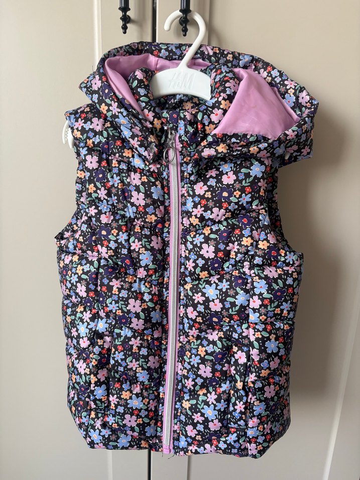 Çiçek desenli, kapüşonlu kız çocuk yeleği. Fermuarlı ve kolsuz, rahat ve sıcak kumaştan, trend sokak stili için uygundur.