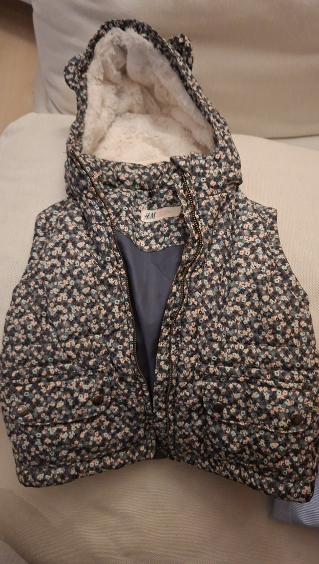 Yüksek yakalı, çiçek desenli kız çocuk yeleği. Kürk detaylı, ince ve rahat kesim, gri tonlarında sokak stili için uygun.