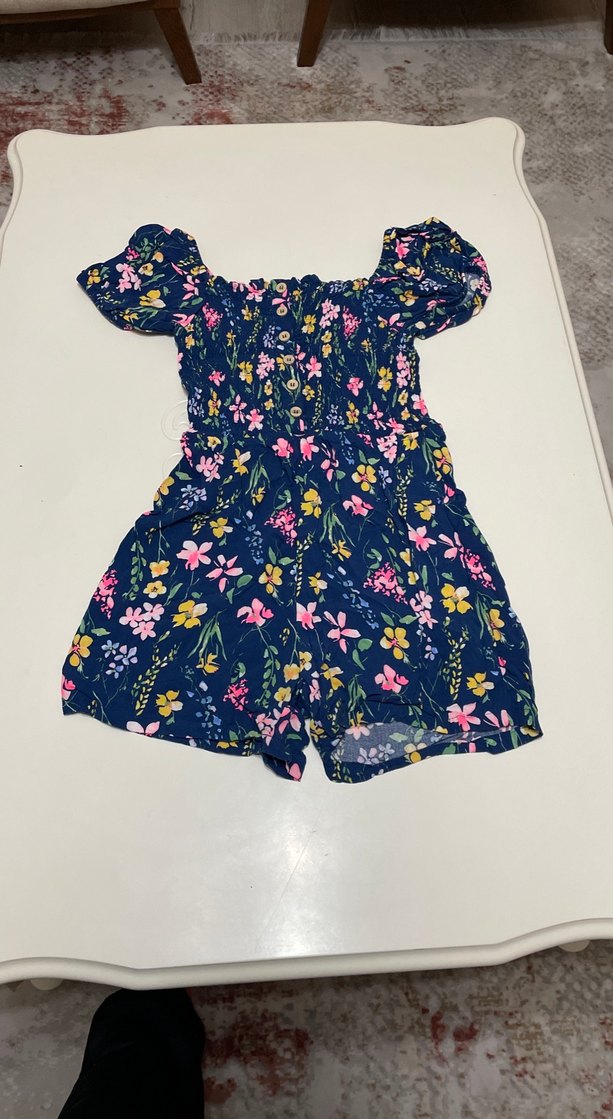 Renkli çiçek desenli, kısa kollu ve fırfırlı detaylı kız çocuk tulumu, yumuşak sentetik kumaştan yapılmıştır. 9.10 yaş için uyumlu