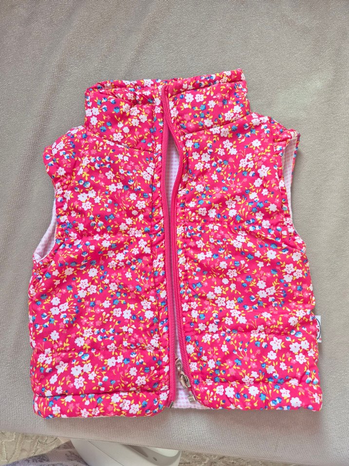 Pembe, çiçek desenli, yüksek yakalı, fermuarlı kız çocuk yeleği. Yumuşak ve sıcak kumaştan, dar kesimle tasarlanmıştır.