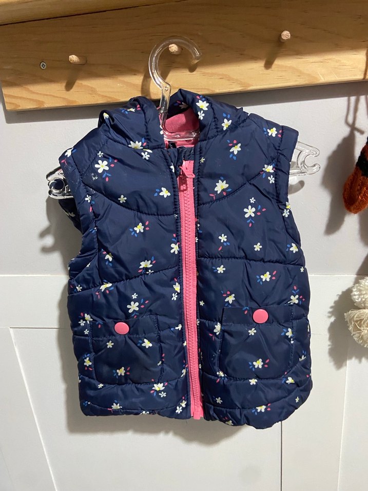 Çiçek desenli, fermuarlı, fitted kesim kız çocuk yeleği. Yumuşak ve sıcak kumaştan, koyu mavi renkte, pembe detaylı.
