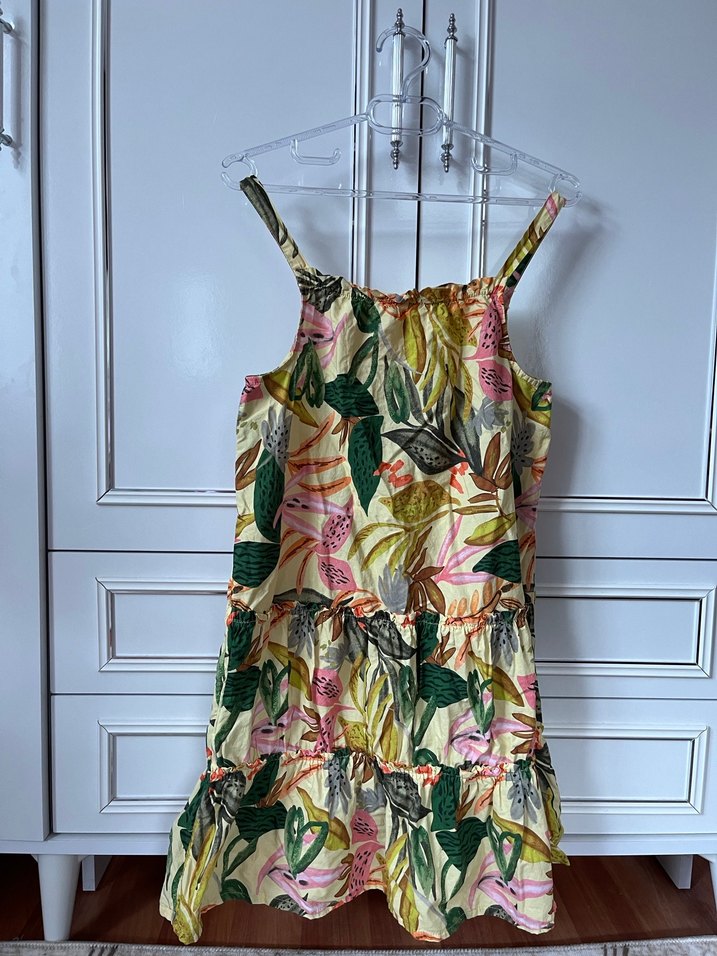 Bu kız elbisesi ince askılı ve straplez yaka ile ruffle detaylara sahiptir. Sentetik kumaştan yapılmış, bol kesim ve renkli baskılı bohem tarzda bir modeldir.