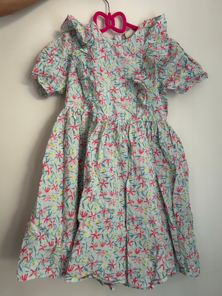 Bu bol kesim kız elbisesi, pastel çok renkli çiçek desenli, fırfırlı ve kısa kolludur. Askısız yakaya sahiptir ve yumuşak sentetik kumaştan yapılmıştır. Bir kaç kez kullanıldı.