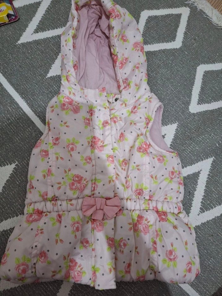 Kapüşonlu, çiçek desenli pembe kız yeleği. Belinde fırfır detayı ve rahat kesimiyle günlük kullanıma uygun, yumuşak sentetik kumaştan yapılmıştır.