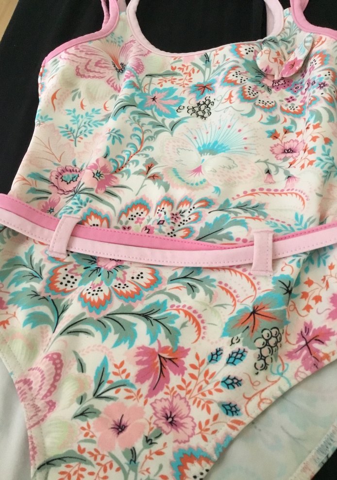 Çiçek desenli, ince askılı ve pembe kemer detaylı bohem tarzda kız mayo. Askılarında hafif sökülme olmuştu. Tamir edildi.