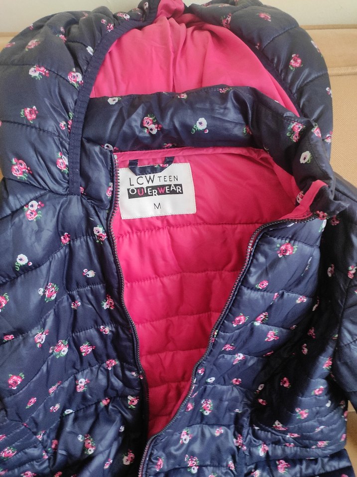 Koyu pembe sentetik kumaş üzerine çiçek desenli, fermuarlı, kesimli kız montu. Çentikli yaka ve sokak stiline uygun tasarım.