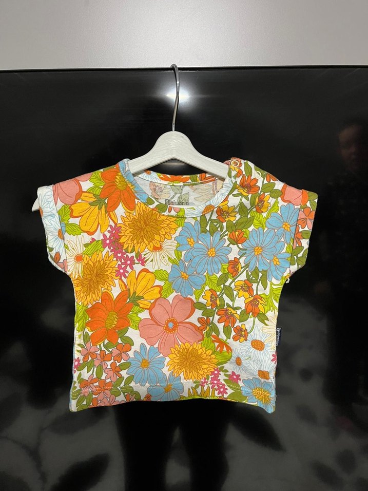 Renkli çiçek desenli, kısa kollu, yuvarlak yaka, düğmeli ve bol kesim kız tişörtü. Yumuşak dokulu kumaştan üretilmiştir.