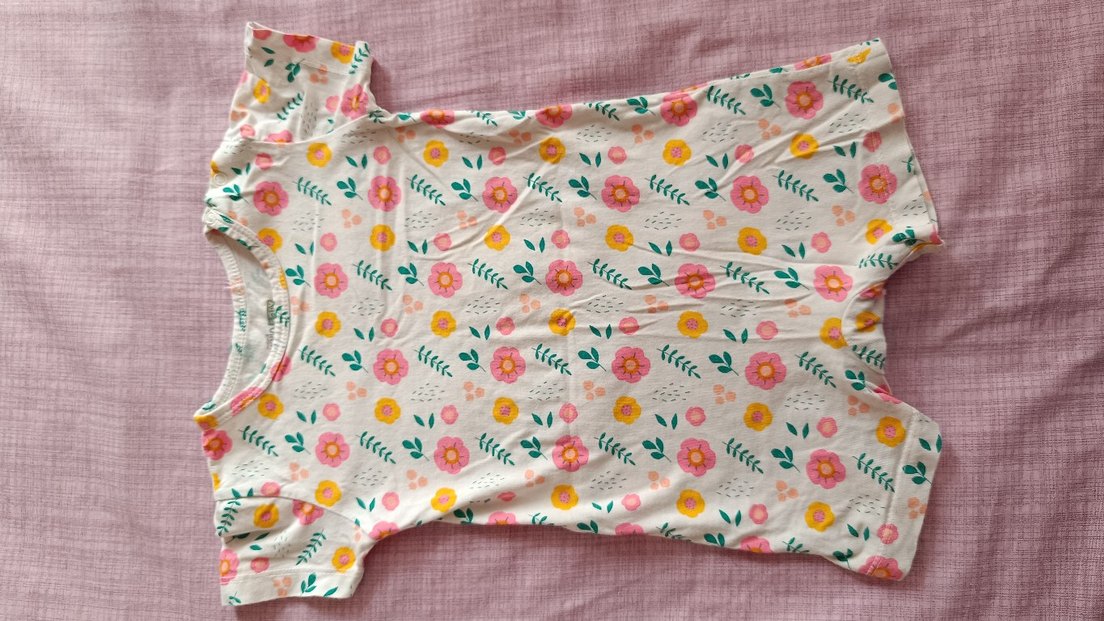 Yumuşak sentetik kumaştan, pembe pastel renkte, çiçek desenli kız bebek tulumu