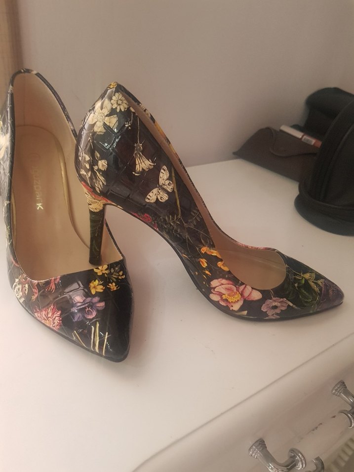 Koyu renkli çok renkli çiçek desenli stiletto topuklu ayakkabılar, tokalı detaylarla romantik akşamlar için uygundur. Vintage ve modern tarzı birleştirir.