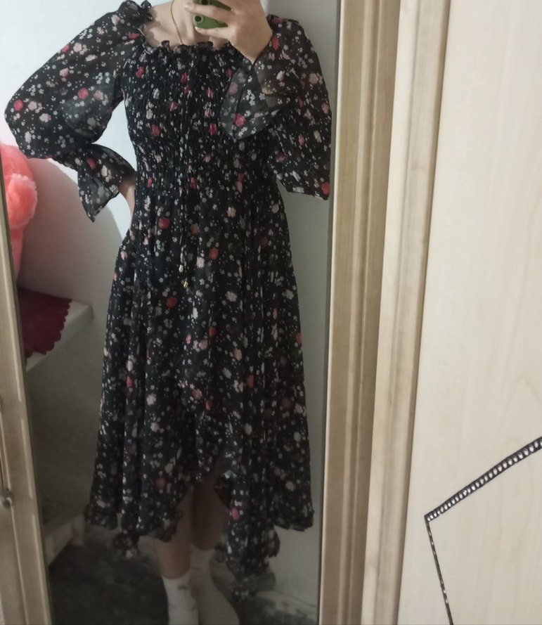 Uzun kollu, fırfırlı detaylı, kare yakali, bol kesim bohem midi elbise. Koyu renkli çok renkli çiçek deseni ve yumuşak kumaş içerir. yan taraflar uzun, içe doğru kisalarak ic bacak yırtmacı detayi ekleniyor