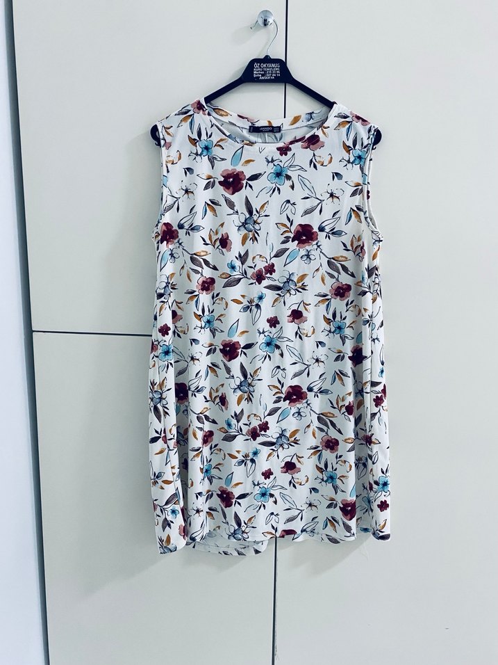 Çiçek desenli, kolsuz ve bol kesim hamile elbisesi. Kısa boylu, hafif renkli tasarıma sahiptir. Günlük kullanıma uygundur. 2 defa kullanıldı.