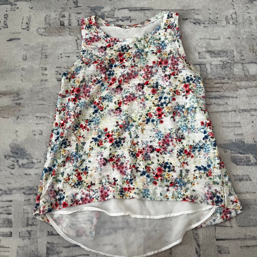 Çiçek desenli, kolsuz ve volan detaylı bluz. Askısız yaka ve bol.