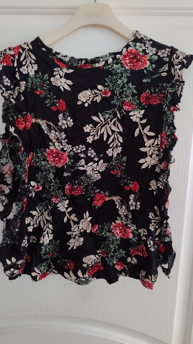 Kolsuz, çiçek desenli bu bluz, V yaka ve fırfır detaylarıyla bol kesimdir, sentetik kumaştan üretilmiştir.