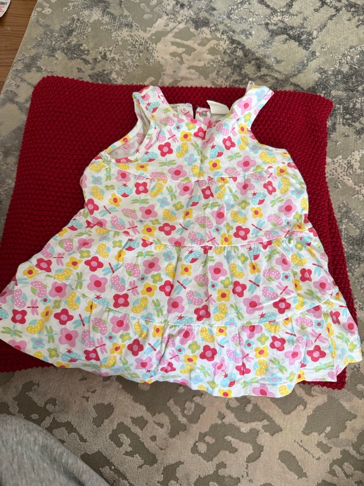 Renkli, çiçek desenli, kolsuz ve fırfırlı kız elbisesi. Sentetik kumaştan, bol kesim ve rahat kullanımlı.