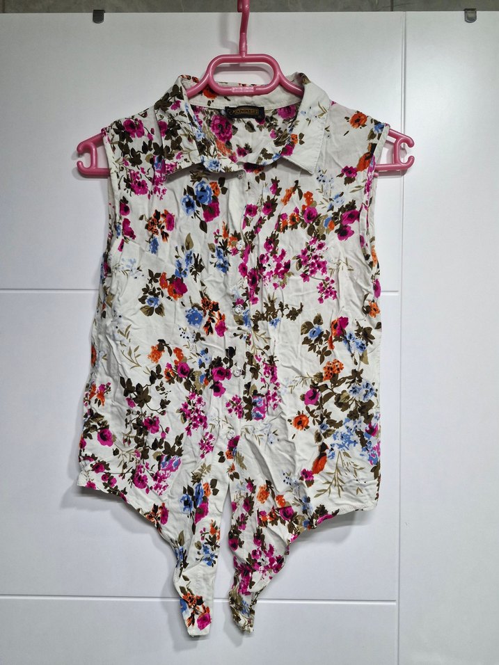 Kolsuz, dar kesim mini gömlek, yakalı ve düğmeli. Sentetik kumaştan, canlı pastel çiçek desenli, bohem tarz için uygun. L/XL bedenlere uygundur.
