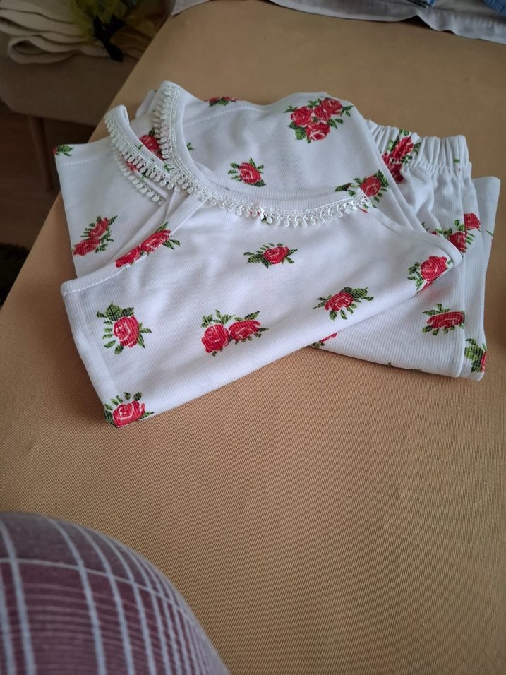 Renkli çiçek desenlerine sahip beyaz, kolsuz, bol kesim kısa pijama takımı. Rahat ve geleneksel tarzda, mini boyda. L beden bayan şortlu ikili takım