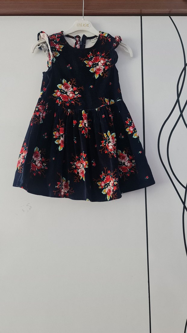 Koyu zemin üzerinde çiçek desenli, kolsuz ve fırfır detaylı, dar kesim kız çocuk elbisesi. Sentetik kumaştan dısı kadifemsi, bohem tarzda, askısız yaka.