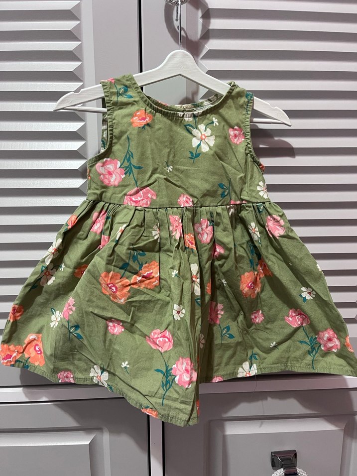 Açık yeşil renkte, kolsuz, bol kesim, pileli ve çiçek desenli yumuşak dokulu kız elbisesi.