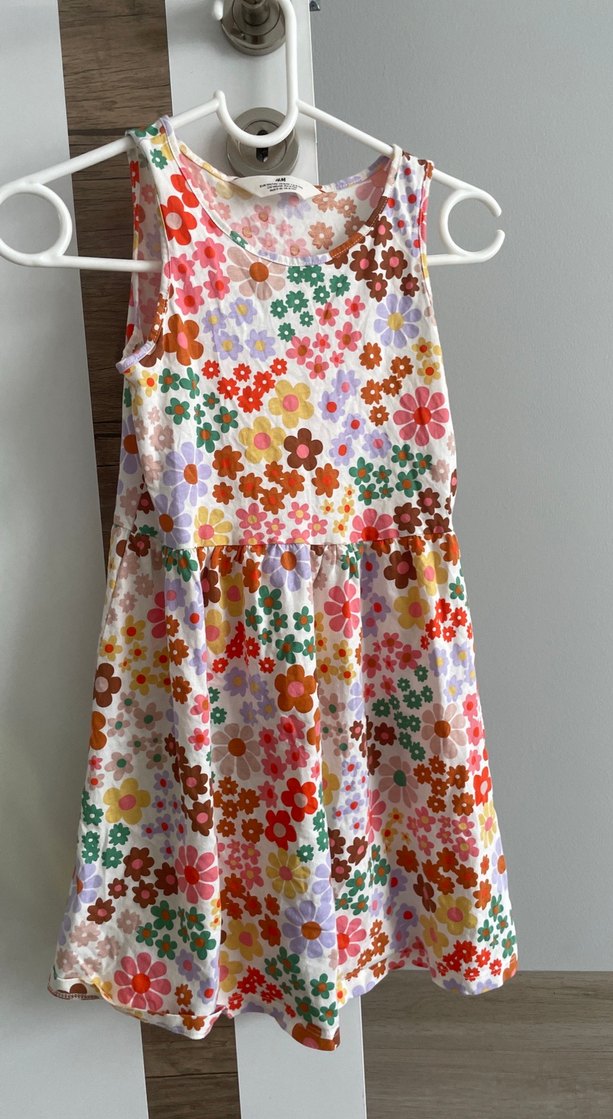 Kolsuz, çiçek desenli, bol kesim ve volan detaylı kız elbisesi, yumuşak tekstil kumaştan üretilmiştir.