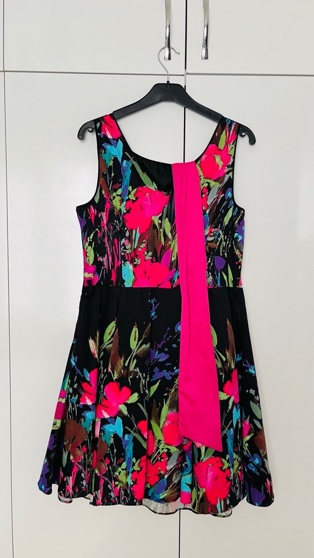 Bu kolsuz mini elbise, koyu zemin üzerinde canlı çiçek desenleri ve pile detaylarıyla dikkat çeker. Canlı pembe kuşak outdoor etkinlikler için uygundur.