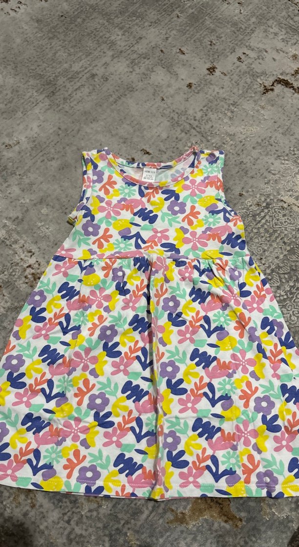 Kolsuz, renkli çiçek desenli kız elbisesi, yumuşak sentetik kumaştan. Rahat kullanım için bol kesim ve fırfır detaylı.