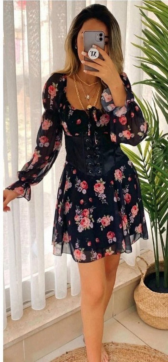 Çiçek desenli, ince uzun kollu, bol kesim mini elbise. Korse detaylı ve düğmeli, romantik akşamlar için uygundur.