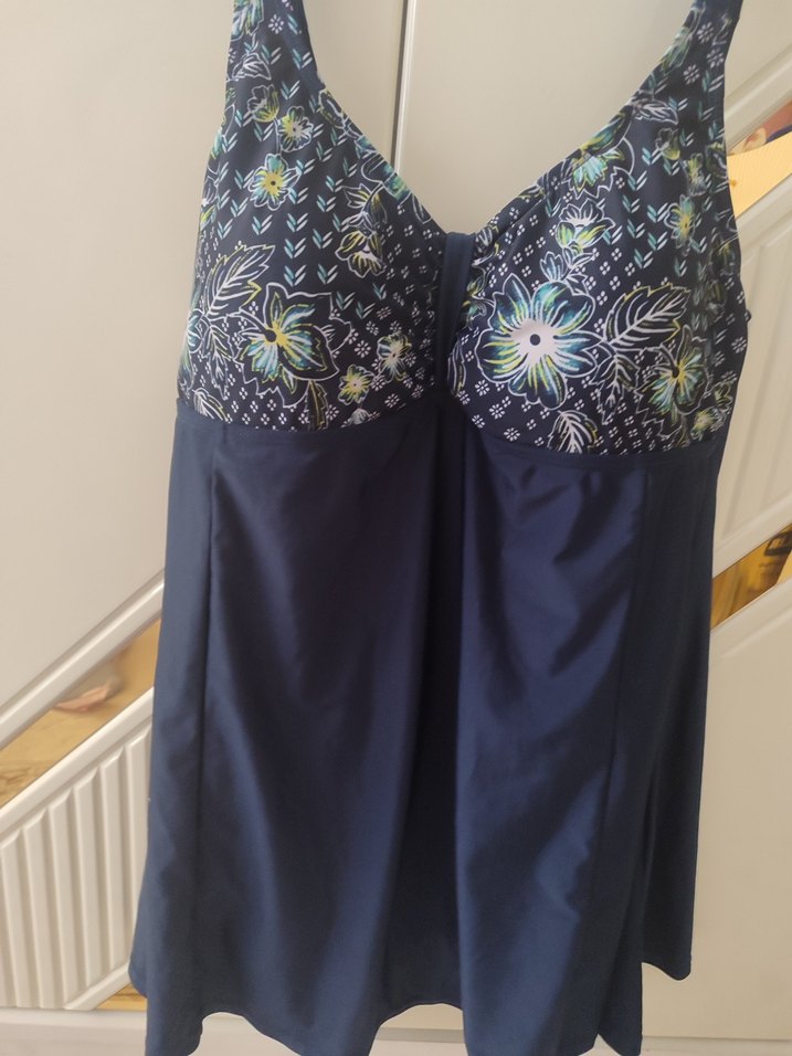 yeni gibi bir defa giyildi çiçek desenli üst kısmı ve lacivert rengiyle, midi boy, kolsuz mayo