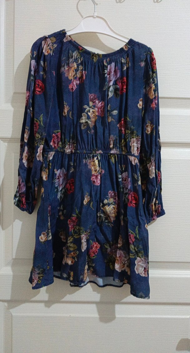 Lacivert, çiçek desenli, uzun kollu, tekne yaka, 7 yaş için uygundur.