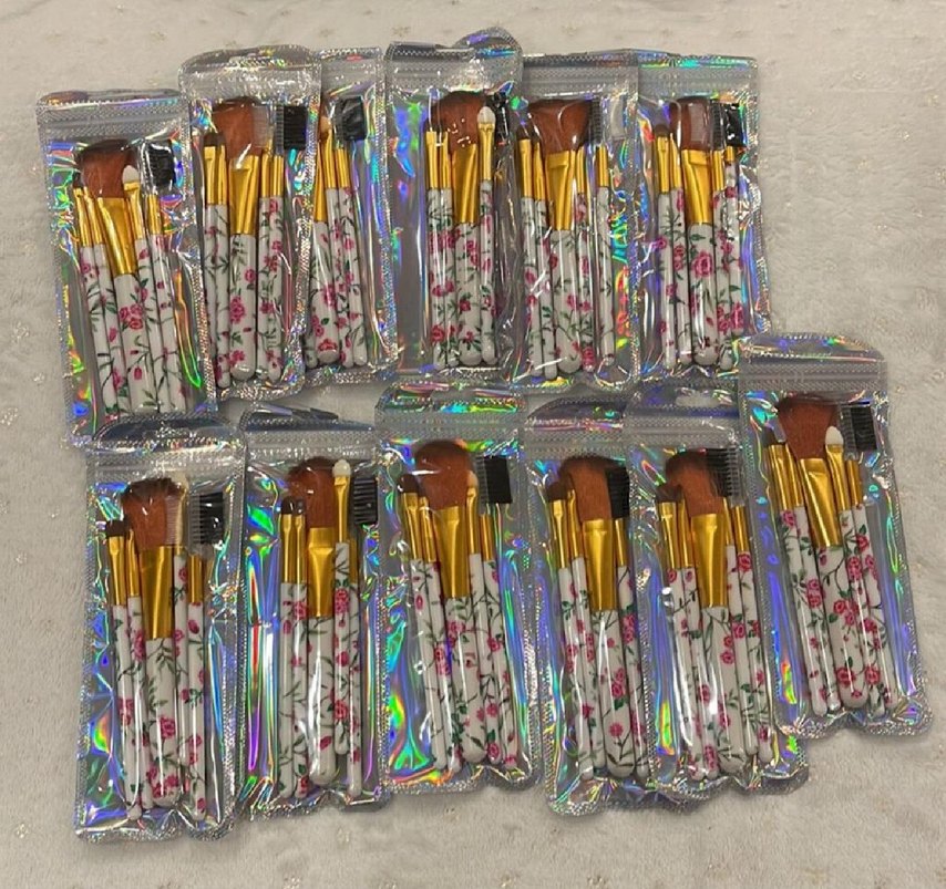 Çiçek desenli saplara ve altın renkli metal kısımlara sahip çoklu makyaj fırça seti, holografik kılıflarda paketlenmiştir.