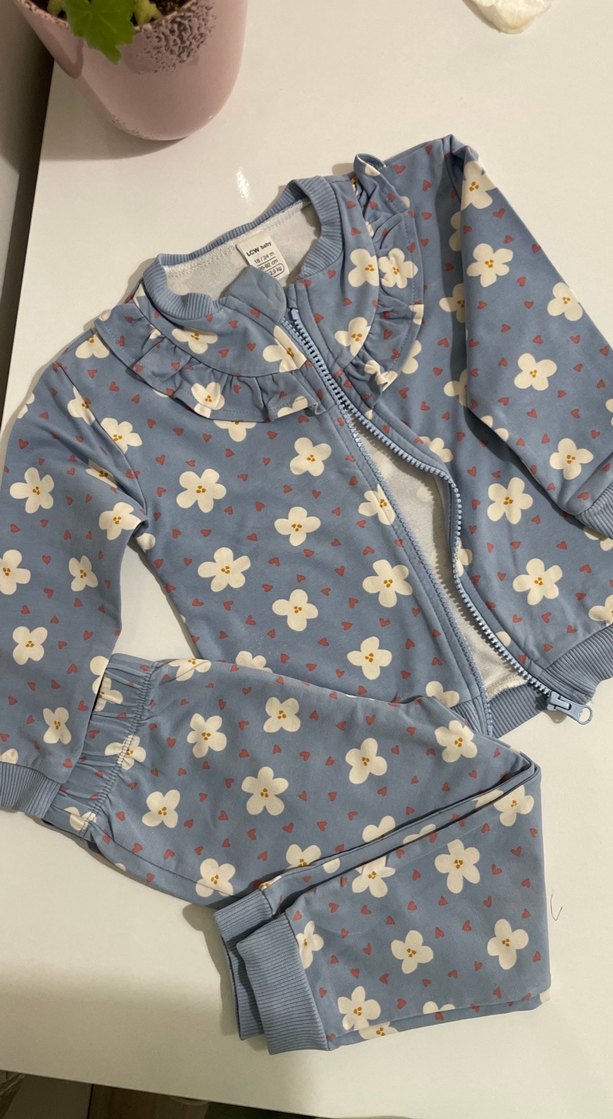 Çok minik bir lekesi var hiç belli olmuyor bile onunla uğraşmadım büyük ihtimal çıkar . Rengi de yakından çektiğim fotolarda daha belli . uzun kollu, çiçek ve küçük kalp desenli bebek kız takımı. Üst parçada fırfırlı yaka ve fermuar bulunur.