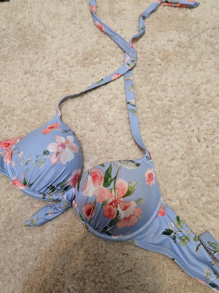 Pastel çiçek desenli, kalın askılı, bohem tarzda mavi bikini üstü, ve vücuda oturan kesimde dolgulu