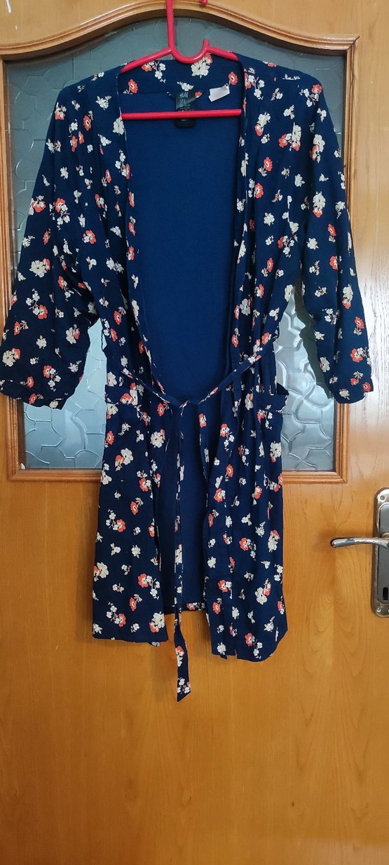 Koyu mavi, çiçek desenli, uzun kollu, düğmeli ve bol kesim bohem tarzında kadın kimono. Sentetik kumaştan üretilmiştir.