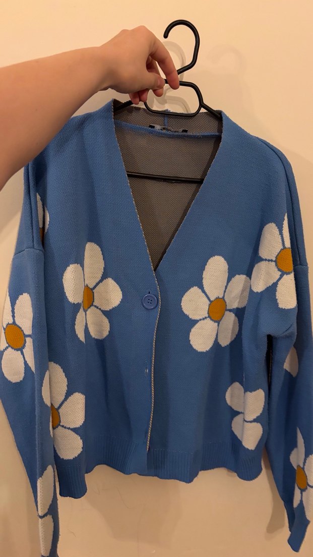 Düğmeli, çiçek desenli mavi hırka, bol kesim ve uzun kollu. V yakalı, midi boy ve pastel renk tonunda, günlük sokak stili için uygun.