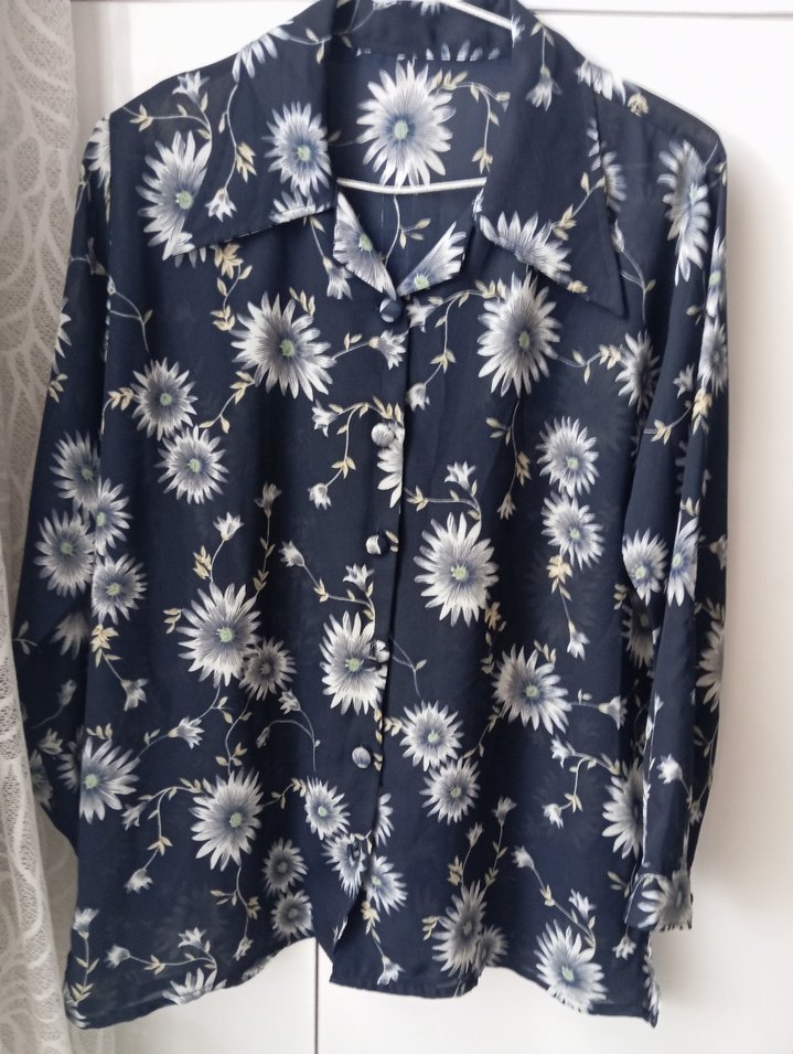 Uzun kollu, düğmeli ve yakalı bu gömlek mavi kumaş üzerine vintage çiçek deseni taşır. Salaş kesimi ve midi boyuyla bohem tarzı yansıtır.
