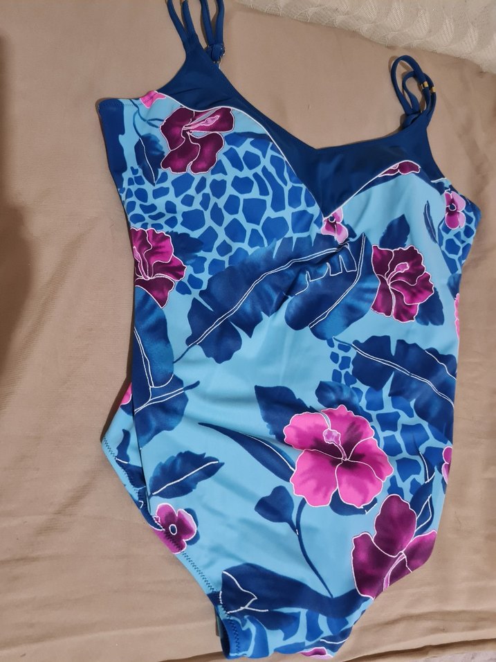 Çift bantlı askılara sahip, çiçek ve yaprak desenli renkli mavi mayo.Tertemiz,kusursuz.Esnetmeden ve biraz esneterek ölculerini fotograflara ekledim.42 beden tahmini isaretledim
