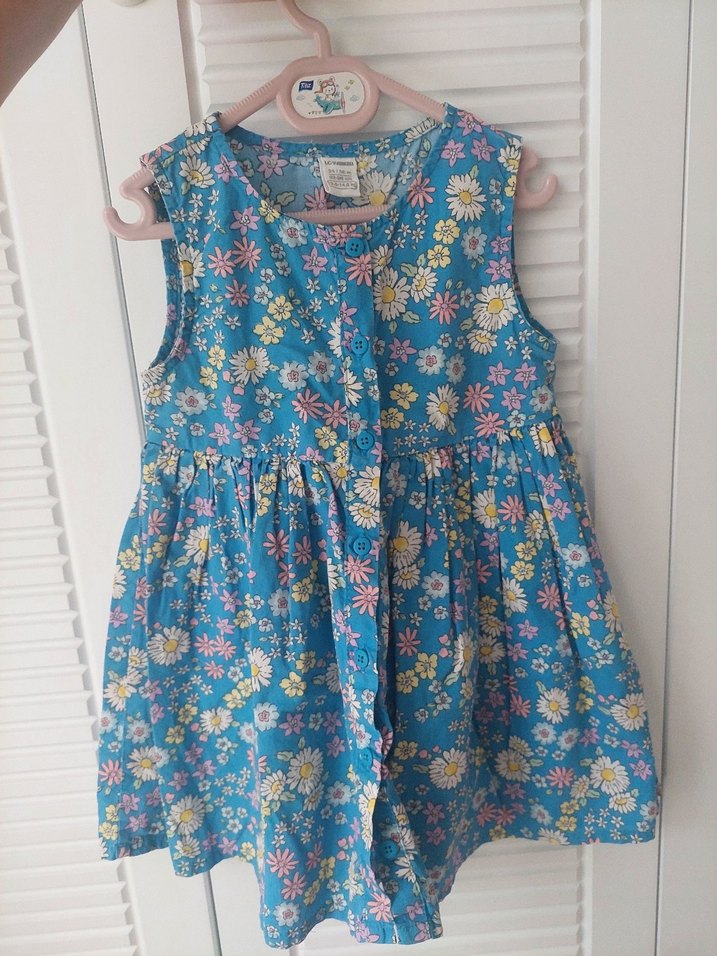 Kolsuz, düğmeli mavi kız elbisesi, renkli çiçek desenli ve bol kesim, bohem tarzı yansıtıyor.