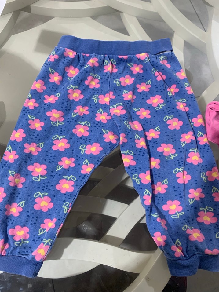 Yumuşak fleece kumaştan, elastik bel bantlı, mavi zemin üzerinde renkli pembe çiçek desenli fitted kız tayt.