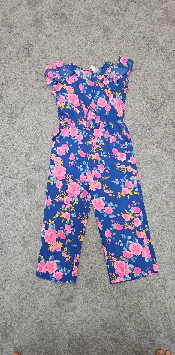 Mavi zemin üzerine renkli çiçek desenli, kolsuz, bol kesim kız tulumu, fırfır detaylı ve yumuşak sentetik kumaştan üretilmiştir.
