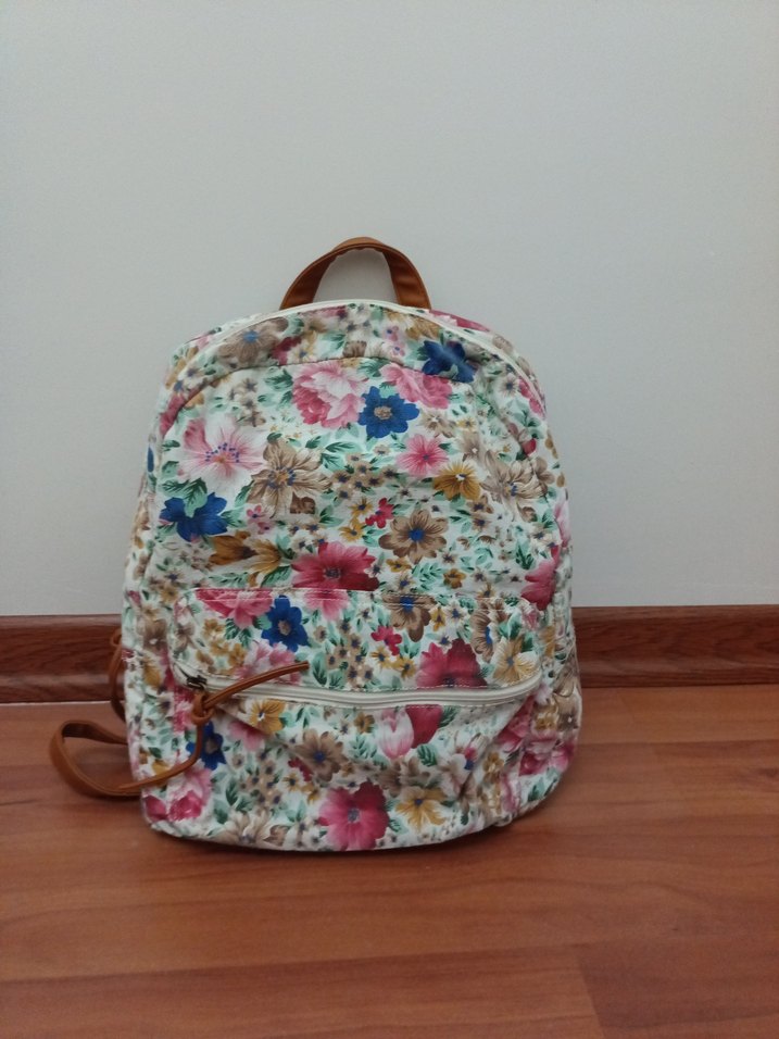 renkli çiçek desenli ve tokalı günlük kullanıma uygun sırt çantası.