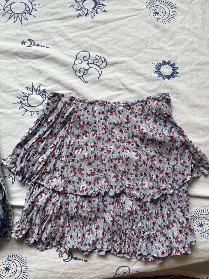 Mavi renkli, çok renkli çiçek desenli, bol kesimli ve fırfırlı bohem mini şort etek . günlük kullanım için uygun.
