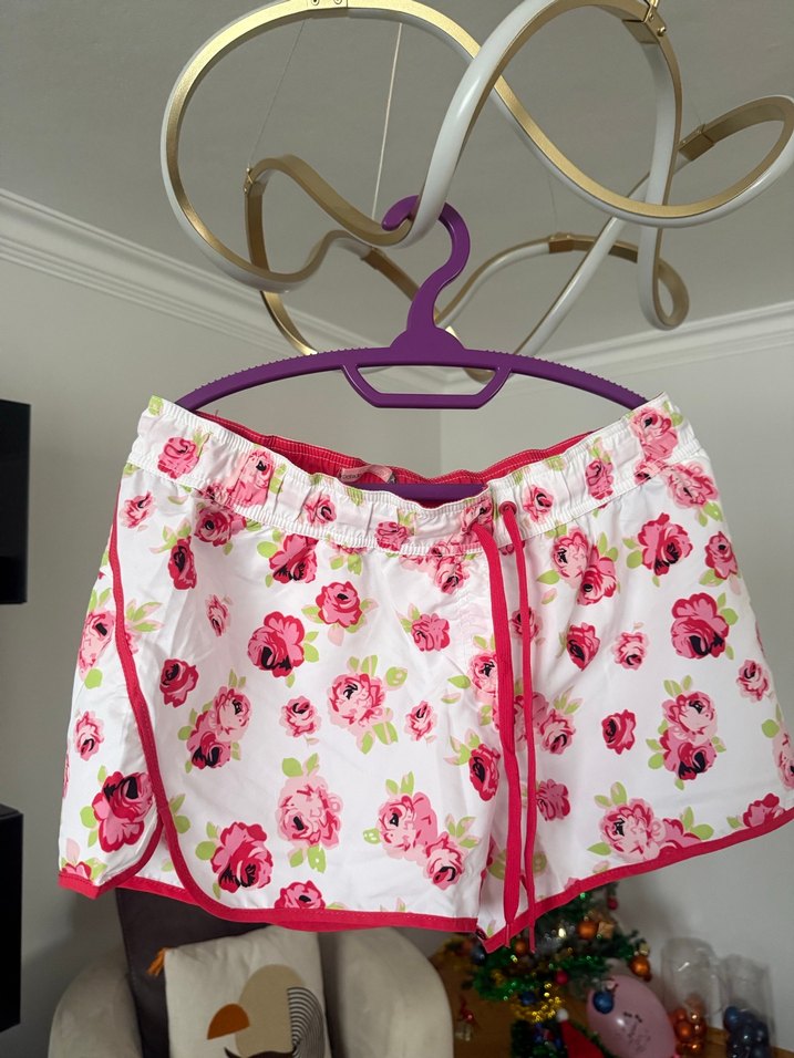 Mayo şort, bol kesim, açık pembe çiçek desenli ve mini şort, rahat günlük kullanım için uygundur.