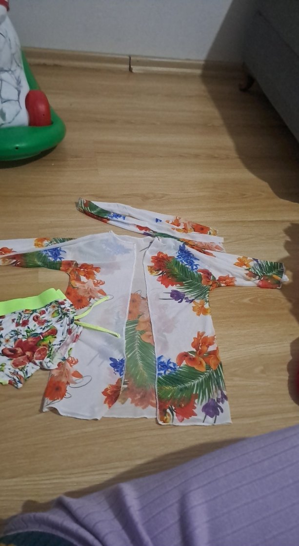 Çiçek desenli, uzun kollu, straplez yaka kısa ve transparan mini kimono, hafif sentetik kumaştan, bol kesim ve bohem tarzda.