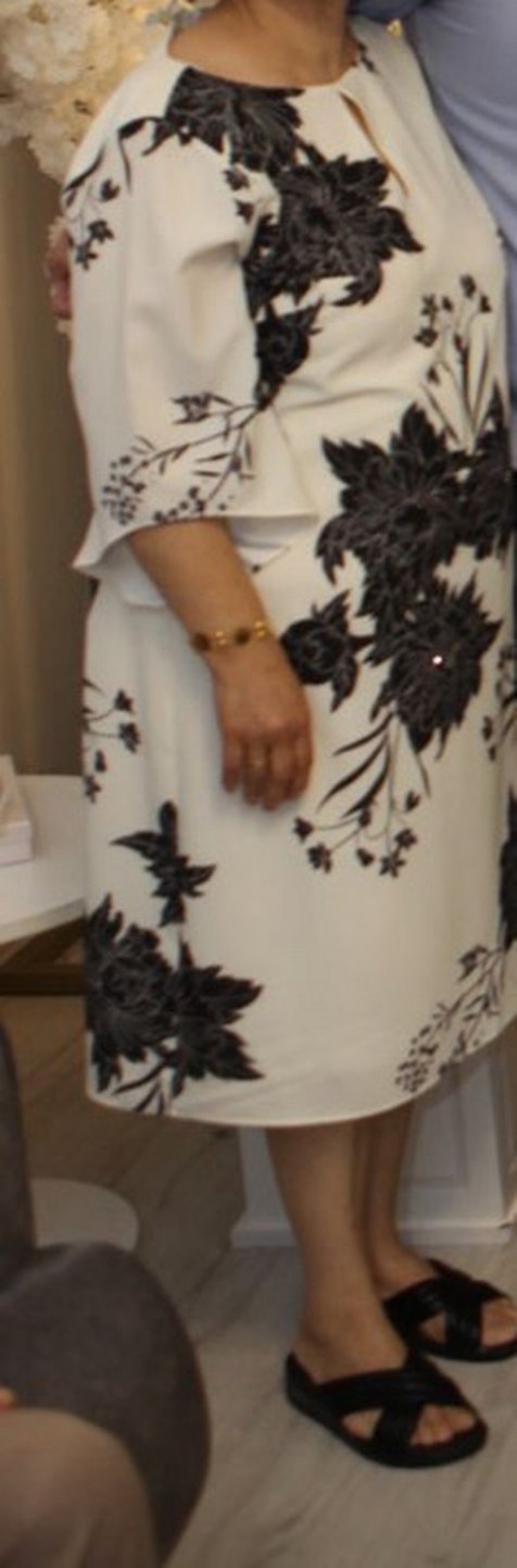 Beyaz renkte, koyu çiçek desenli, kısa kollu ve salaş kesim midi abiye elbisedir. Tekne yaka detaylıdır. Sadece 2 saat giyildi, yenidir, hiçbir hasarı yoktur.