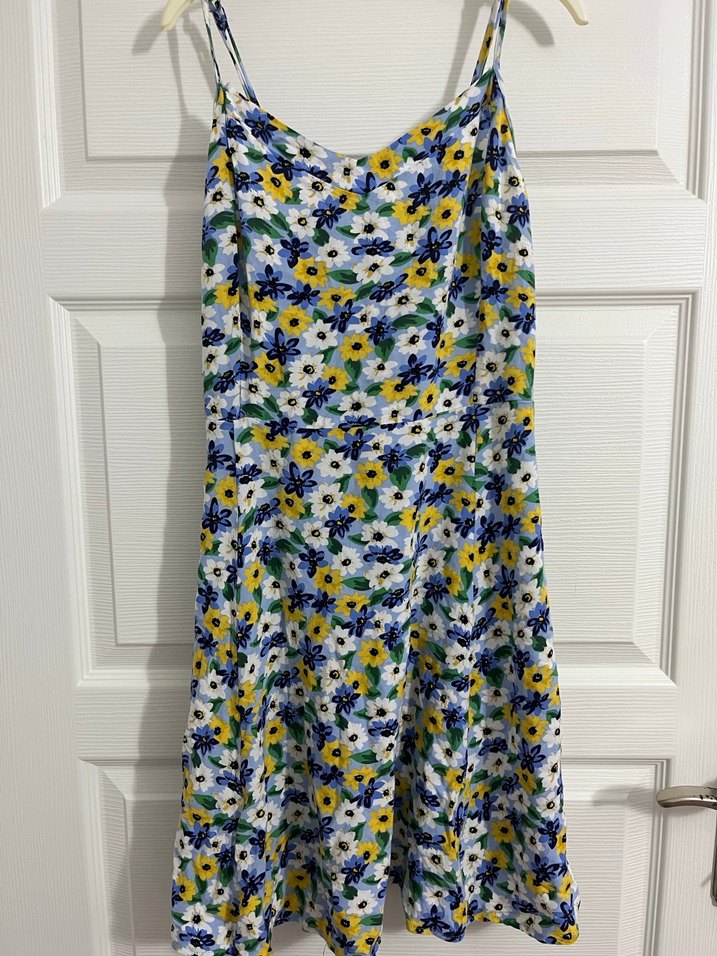Bu askılı midi elbise, hafif çok renkli çiçek deseni, bol kesim ve pileli tasarıma sahiptir. Straplez yaka ip askılı ve günlük kullanıma uygun bohem tarzda bir üründür. az giyinilmistir