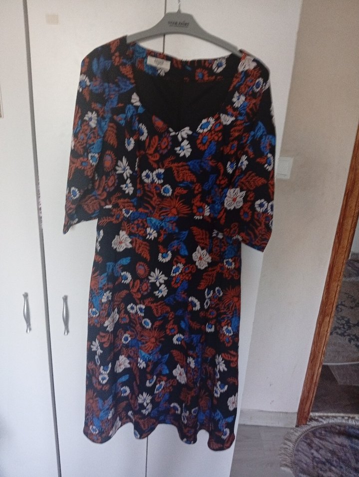 Sentetik kumaştan, V yakalı, kısa kollu, bol kesim, çiçek desenli midi bohem elbise. Drapeli ve çok renkli karanlık tonlarda.