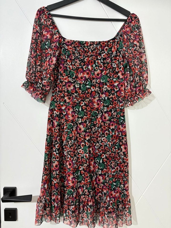 Bohem tarzda, kısa balon kollu ve tekne yaka midi elbise. Yumuşak sentetik kumaştan, koyu renkli çok renkli çiçek desenli ve fırfır detaylı, romantik akşamlar için uygun.