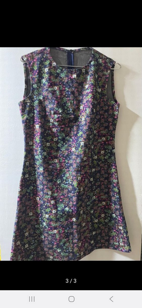Kolsuz, yüksek yakalı ve düğmeli, çiçek desenli midi elbise. Kot kumaştan, vintage bohem tarzını yansıtır.