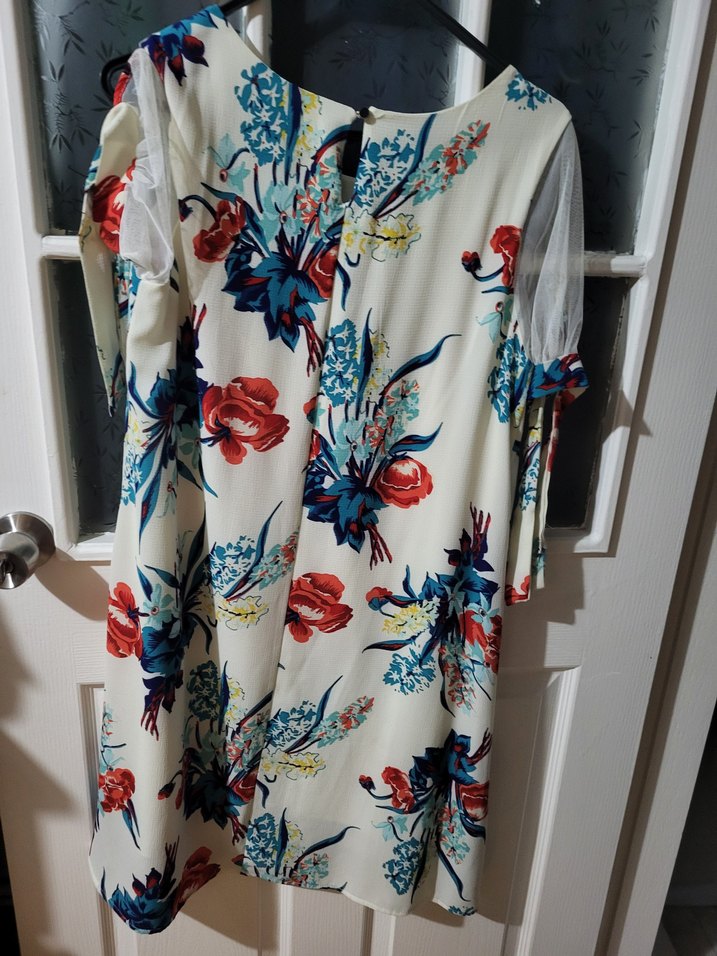 Bu midi elbise, bol kesim ve drapeli tasarımıyla kısa kolludur. V yaka ve çok renkli çiçek desenine sahip hafif sentetik kumaftan yapılmıştır, bohem tarzını yansıtır.